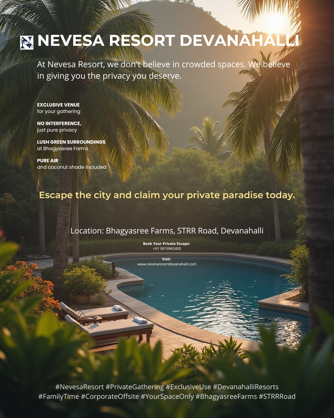 Nothing kills the vibe like unwanted interruptions. At Nevesa Resort, we offer an exclusive-use experience, ensuring your event remains intimate, focused, and uninterrupted. 🌟 Experience the Difference: # Private access to facilities # Undisturbed team-building or family time # Fresh farm air to boost creativity Make your gathering truly exclusive. Connect with us today. 📞 Enquire Now: +91 9019942400 📧 Email: enquiry@nevesaresortdevanaalli.com 🌐 www.nevesaresortdevanahalli.com #CorporateRetreat #FamilyGathering #PrivateEvent #TeamBuilding #ResortDevanahalli #ExclusiveVenue #BhagyasreeFarms