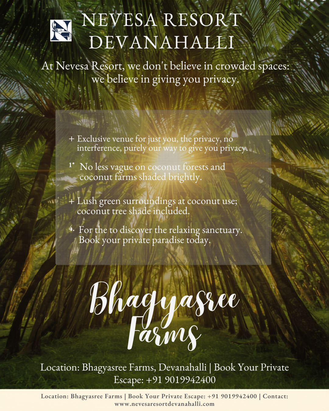 It’s not just a resort; it’s your private sanctuary. 🤫🥥 At Nevesa Resort, we believe the best gatherings are the ones where you don’t have to share the moment. Whether it’s a raucous reunion with old friends or a quiet family milestone, the space is exclusively yours. ✨ No Crowds. No Interruptions. Just Your People. Enjoy the luxury of privacy under the shade of our coconut trees, surrounded by the fresh air of Bhagyasree Farms. Because your story with your loved ones deserves its own setting. 📍 Bhagyasree Farms, STRR Road, Devanahalli 📞 Book your private escape: +91 9019942400 🌐 www.nevesaresortdevanahalli.com #PrivateResort #ExclusiveGatherings #NevesaResort #FamilyTime #FriendsGetaway #Devanahalli #YourOwnSpace #NoCrowds #BangaloreResorts