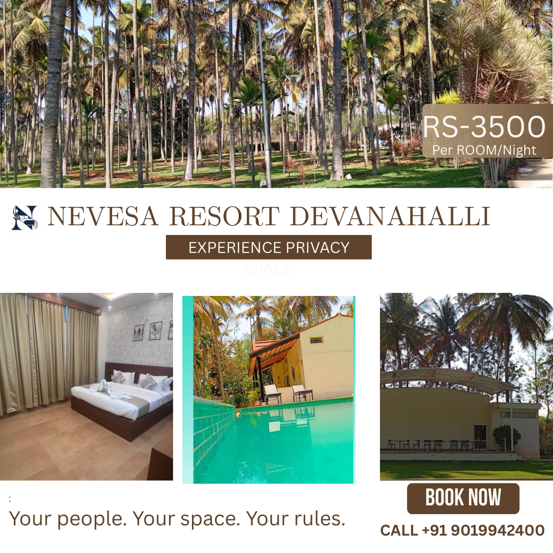 At Nevesa Resort, we don't believe in crowded spaces. We believe in giving you the privacy you deserve. Whether it's a family reunion, a corporate offsite, or a get-together with friends, the entire experience is exclusively yours. 🔒 Why choose Nevesa? ✅ Exclusive venue for your gathering ✅ No interference, just pure privacy ✅ Lush green surroundings at Bhagyasree Farms ✅ Pure air and coconut shade included Escape the city and claim your private paradise today. 📍 Location: Bhagyasree Farms, STRR Road, Devanahalli 📞 Book Your Private Escape: +91 9019942400 🌐 Visit: www.nevesaresortdevanahalli.com #NevesaResort #PrivateGathering #ExclusiveUse #DevanahalliResorts #FamilyTime #CorporateOffsite #YourSpaceOnly #BhagyasreeFarms #STRRRoad